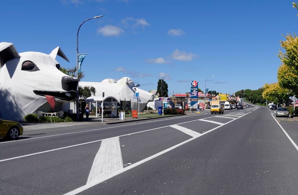Famous for its giant corrugated dog, sheep, and shepherd buildings, Tīrau is an ideal break for food and shopping.