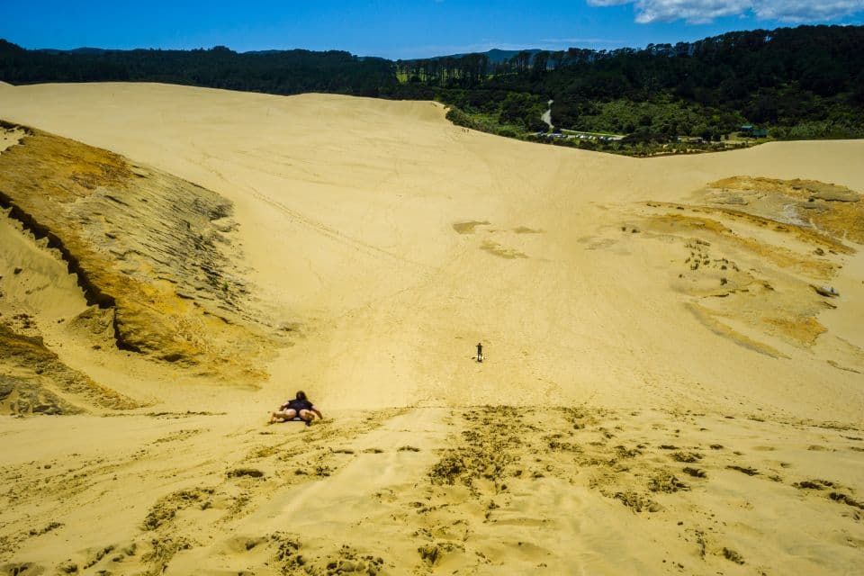 Once there, you can walk up onto the dunes for sweeping views across the valley. Many visitors hire sandboards from operators at the car park for high-speed descents, although DOC notes that sandboarding carries real risk and should be approached cautiously.