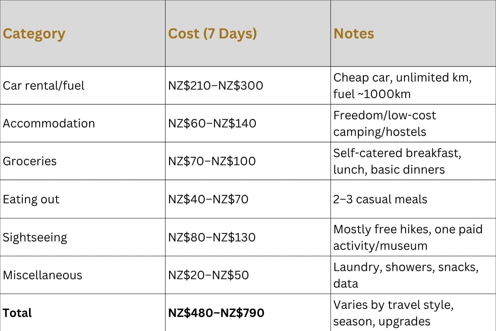 NZ$65–NZ$140 per day, including car rental, fuel, budget accommodation, self-catering, and one paid attraction.
